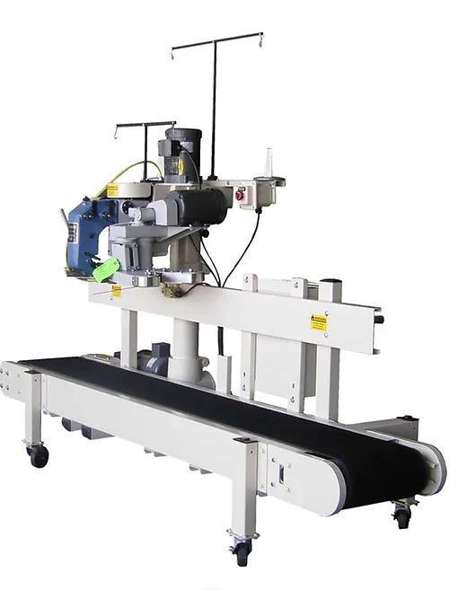 Model 45 Flat Bag Closing Conveyor is shown with a sewing pedestal attached. The belt conveyor is 12″ wide, 30 FPM STD speed, optional 35 and 40 FPM, 8′ and 10′ (optional) overall length