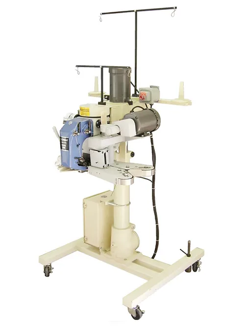 The Bag Closing System pictured here with a sewing pedestal attached. The sewing head plate allows for different types of sewing machines and the mounting brackets for power infeed.